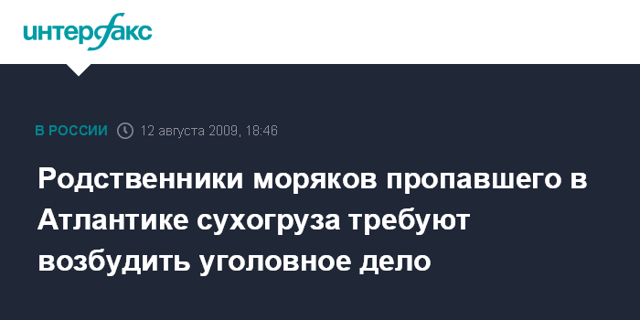 Архангельск. 12 августа. INTERFAX.RU - Родственники членов команды исчезнувшего в Атлантике теплохода "Arctic Sea" требуют возбудить уголовное дело по факту исчезновения людей, сообщил "Интерфаксу" заместитель председателя Северной региональной организации Российского профсоюза моряков Сергей Портенко.