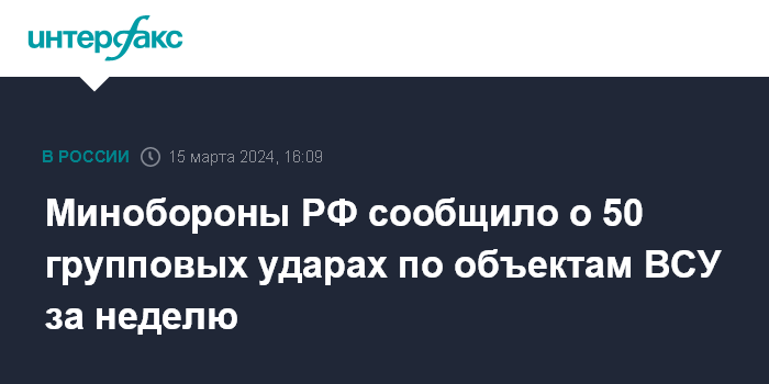 Москва. 15 марта. INTERFAX.RU - Российские военные за неделю нанесли полсотни групповых ударов по аэродромной инфраструктуре, цехам ремонта, складам с беспилотниками и безэкипажными катерами и другим объектам вооруженных сил Украины (ВСУ), заявили в Минобороны РФ.