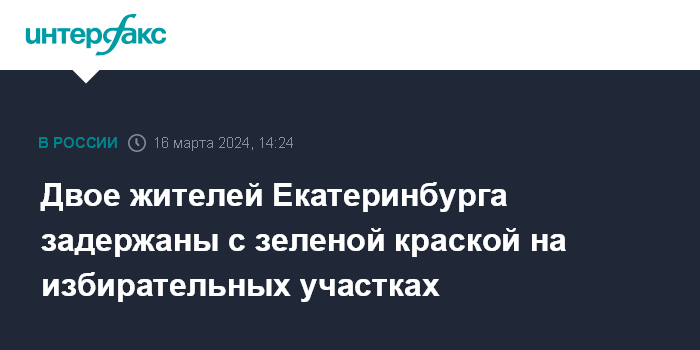 Москва. 16 марта. INTERFAX.RU - В Екатеринбурге задержаны два человека, которые принесли с собой зеленую краску на избирательные участки, сообщает в субботу Центр общественного наблюдения Свердловской области.