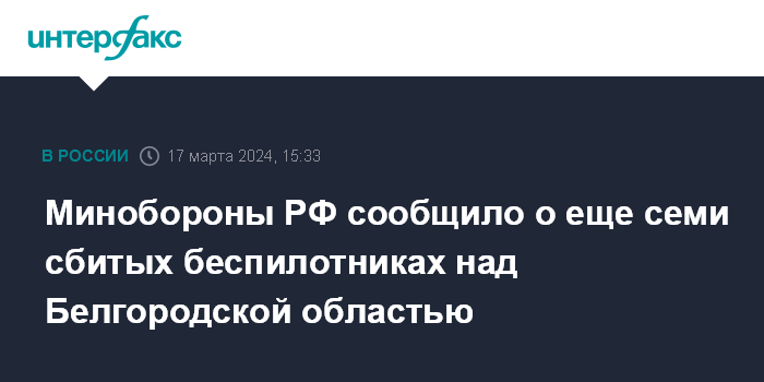 Москва. 17 марта. INTERFAX.RU - Российские военные в воскресенье сбили еще семь украинских беспилотников самолетного типа над Белгородской областью, заявили в Минобороны РФ.