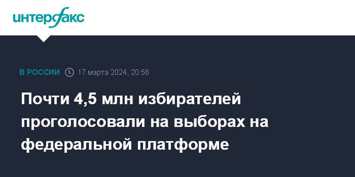 Москва. 17 марта. INTERFAX.RU - Почти 4,5 млн избирателей проголосовали с помощью дистанционного электронного голосования (ДЭГ) на выборах президента РФ на федеральной платформе, сообщил председатель территориальной избирательной комиссии (ТИК) ДЭГ Олег Артамонов.