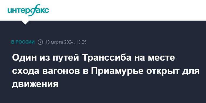 Москва. 18 марта. INTERFAX.RU - Движение поездов открыто по одному пути на участке перегона Горелый - Бамовская в Амурской области, где в понедельник утром из-за ДТП сошли с рельсов вагоны грузового поезда, сообщает Забайкальская железная дорога (ЗабЖД).