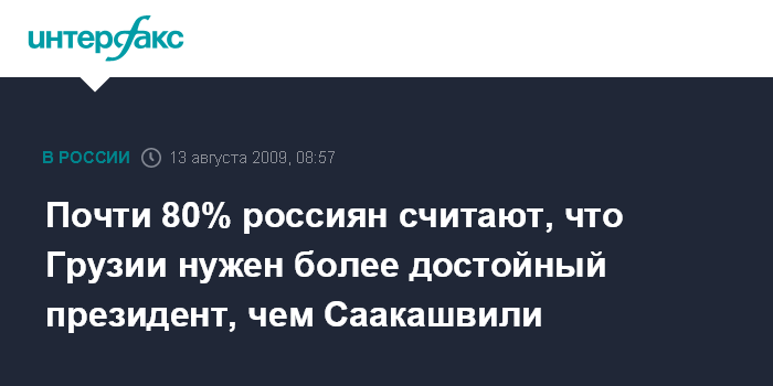 В ходе опроса, который ВЦИОМ проводил в конце июля в 140 населенных пунктах в 42 областях, краях и республиках России, подавляющее большинство его участников (79%) высказали мнение, что Грузии сегодня нужен президент более достойный, чем Саакашвили. 11% опрошенных отметили, что им не во всем нравится грузинский президент, но они уважают выбор народа. Лишь в двух случаях из ста наши сограждане выражают уважение и симпатию к нынешнему президенту Грузии, показало исследование социологов.