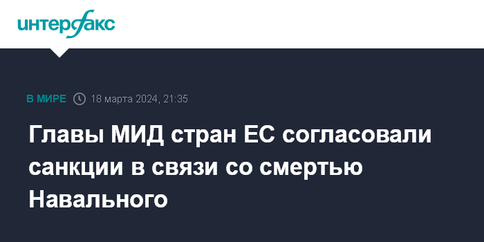 Москва. 18 марта. INTERFAX.RU - Главы МИД стран ЕС согласовали антироссийские санкции в связи со смертью Алексея Навального, заявил в понедельник журналистам на пресс-конференции глава европейской дипломатии Жозеп Боррель.