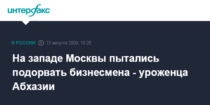 Москва. 13 августа. INTERFAX.RU - В Москве в Западном административном округе совершено покушение на предпринимателя Вахтанга Джгомадзе, уроженца Абхазии. Как сообщил "Интерфаксу" источник в правоохранительных органах, в четверг около 8:30 в ОВД "Ново-Переделкино" поступил сигнал о взрыве в здании физкультурно-оздоровительного комплекса на Чоботовской улице.