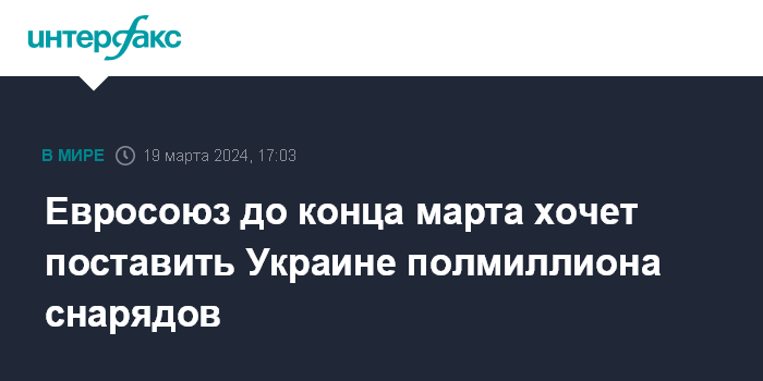 Москва. 19 марта. INTERFAX.RU - Страны Евросоюза поставят Украине до конца марта около половины от миллиона снарядов, обещанных Киеву, сообщил Петер Стано, пресс-секретарь главы европейской дипломатии Жозепа Борреля.