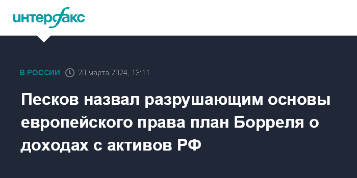 Москва. 20 марта. INTERFAX.RU - В Кремле считают, что предложение главы дипломатии Евросоюза Жозепа Борреля о направлении доходов замороженных российских активов для помощи Украине разрушает юридические основы европейского и международного права.