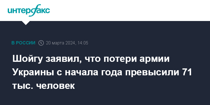 Москва. 20 марта. INTERFAX.RU - Вооруженные силы Украины с начала текущего года потеряли свыше 71 тысячи человек и 11 тысяч единиц боевой техники, сообщил министр обороны РФ Сергей Шойгу.