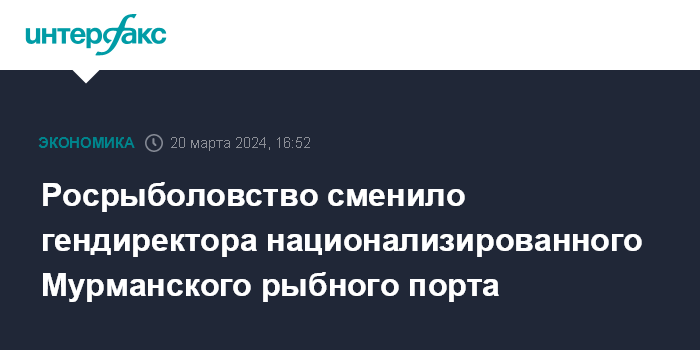 Москва. 20 марта. INTERFAX.RU - Росрыболовство назначило новым генеральным директором национализированного в 2022 году АО "Мурманский морской рыбный порт" (ММРП) Андрея Бородина, сообщила пресс-служба ведомства.