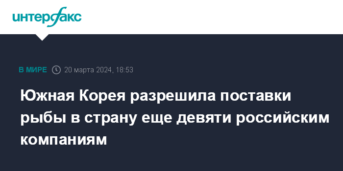 Москва. 20 марта. INTERFAX.RU - Министерство морских дел и рыболовства Южной Кореи разрешило еще девяти российским организациям и судам поставки рыбы и рыбопродукции, в том числе пищевых рыбных субпродуктов, на свой рынок, сообщает Россельхознадзор.