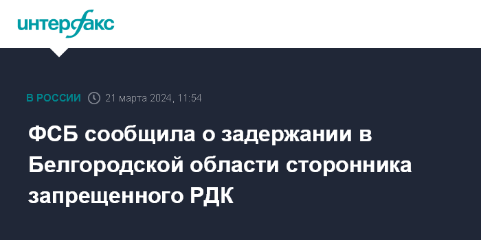 Москва. 21 марта. INTERFAX.RU - ФСБ сообщила о задержании в Белгородской области сторонника запрещенного в РФ "Русского добровольческого корпуса" (РДК, террористическая организация).
