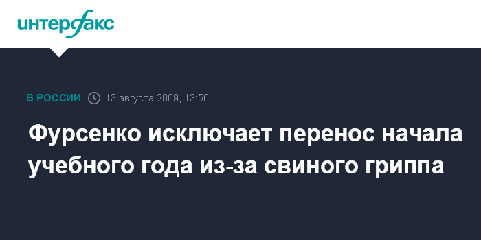 Москва. 13 августа. INTERFAX.RU - Начало учебного года в России не будет переноситься из-за распространения свиного гриппа, заявил министр образования и науки Андрей Фурсенко.
