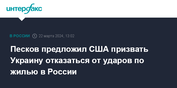 Москва. 22 марта. INTERFAX.RU - В Кремле бы предпочли, чтобы США призвали Украину отказаться от ударов по социальным объектам и жилым домам на территории России, заявил пресс-секретарь президента РФ Дмитрий Песков.