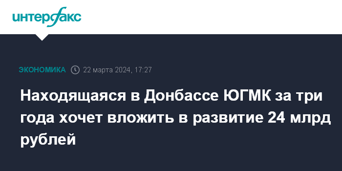 Москва. 22 марта. INTERFAX.RU - "Южный горно-металлургический комплекс" (ЮГМК), объединяющий металлургические, добывающие и коксохимические предприятия в Донецкой и Луганской народных республиках, планирует удвоить мощности производства стали, вложив в развитие 24 млрд рублей.
