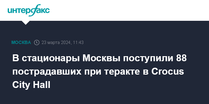 Москва. 23 марта. INTERFAX.RU - В московские стационары поступили 88 человек, пострадавших в результате теракта в Crocus City Hall, сообщил Депздрав Москвы в своем телеграм-канале в субботу.