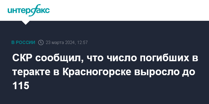 Москва. 23 марта. INTERFAX.RU - Число погибших в результате теракта в подмосковном концертном зале Crocus City Hall на данный момент составляет 115 человек, сообщает СК РФ.