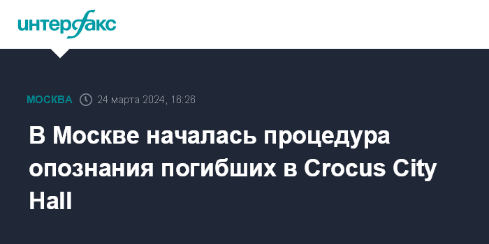 Москва. 24 марта. INTERFAX.RU - В российской столице начаты процедуры опознания погибших в результате теракта в Crocus City Hall, сообщается на сайте департамента здравоохранения Москвы.