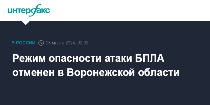 Москва. 25 марта. INTERFAX.RU - Губернатор Воронежской области Александр Гусев сообщил об отмене режима опасности атаки БПЛА.