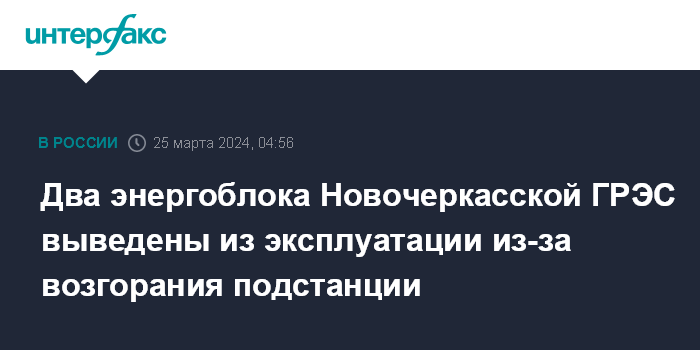 Москва. 25 марта. INTERFAX.RU - Губернатор Ростовской области Василий Голубев сообщил о возгорании на трансформаторной подстанции Новочеркасской ГРЭС.