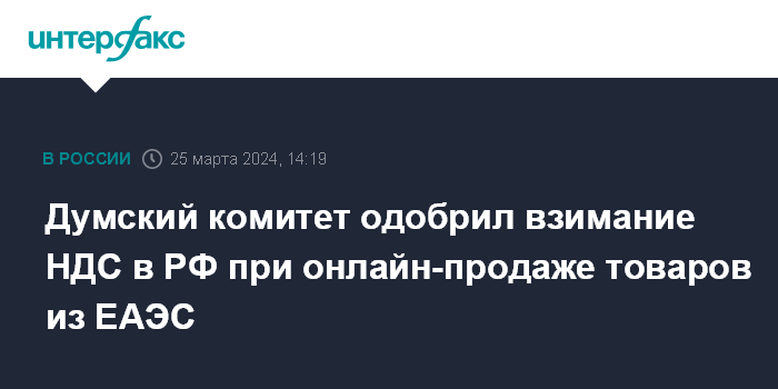 Думский комитет одобрил взимание НДС в РФ при онлайн-продаже товаров из ЕАЭС