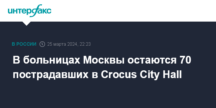 Москва. 25 марта. INTERFAX.RU - В московских больницах остаются 70 пострадавших в результате теракта в Crocus City Hall, в крайне тяжелом состоянии находятся четыре пациента, сообщил глава столичного депздрава Алексей Хрипун.
