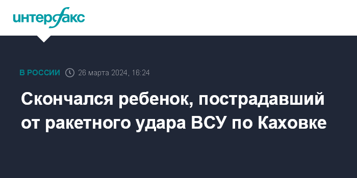 Москва. 26 марта. INTERFAX.RU - Попавшая под ракетный удар ВСУ в понедельник девочка скончалась в Херсонской области, сообщил губернатор региона Владимир Сальдо.