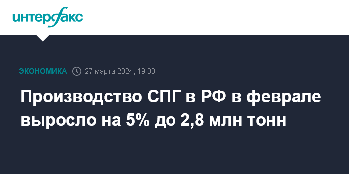 Москва. 27 марта. INTERFAX.RU - Производство крупнотоннажного сжиженного природного газа в России в феврале 2024 года составило 2,8 млн тонн, что на 4,6% больше, чем в феврале 2023 года, сообщил Росстат.