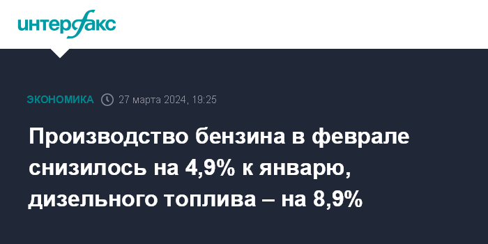 Производство бензина в феврале снизилось на 4,9% к январю, дизельного топлива – на 8,9%