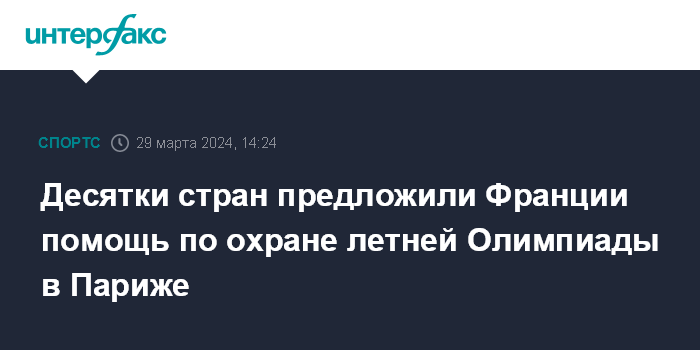 Москва. 29 марта. INTERFAX.RU - Для помощи в обеспечении безопасности XXXIII летних Олимпийских игр в Париже, которые пройдут с 26 июля по 11 августа, 46 государств готовы предоставить Франции свое военное и полицейское подкрепление, сообщает в пятницу газета Ouest-France.