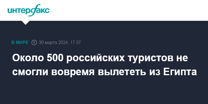 Москва. 30 марта. INTERFAX.RU - Около 500 российских туристов не смогли вылететь вечером 29 марта из Шарм-эль-Шейха в Москву из-за задержки рейса компании Southwind Airlines, сообщает в субботу Минэкономразвития РФ.