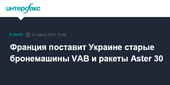 Москва. 31 марта. INTERFAX.RU - Французский министр вооруженных сил Себастьян Лекорню объявил, что Франция поставит Украине сотни старых бронетранспортеров VAB и ракеты Aster 30 в рамках нового пакета помощи.