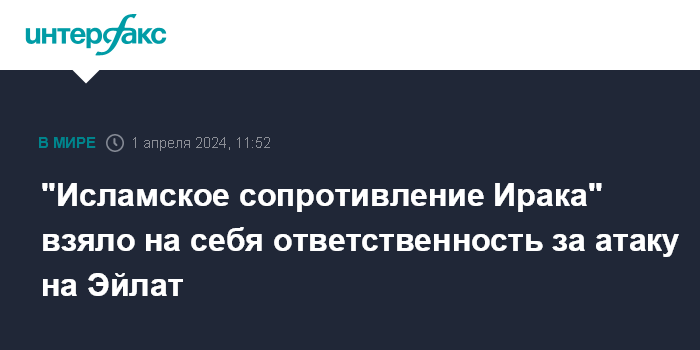 Москва. 1 апреля. INTERFAX.RU - Проиранская военизированная группировка "Исламское сопротивление Ирака" заявила, что 1 апреля совершила атаку на портовый город Эйлат в Израиле, сообщает саудовское издание Arab news.