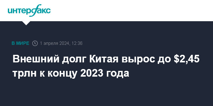 Москва. 1 апреля. INTERFAX.RU - Внешний долг Китая на конец 2023 года составлял $2,45 трлн, по данным Государственного управления валютного контроля (SAFE).