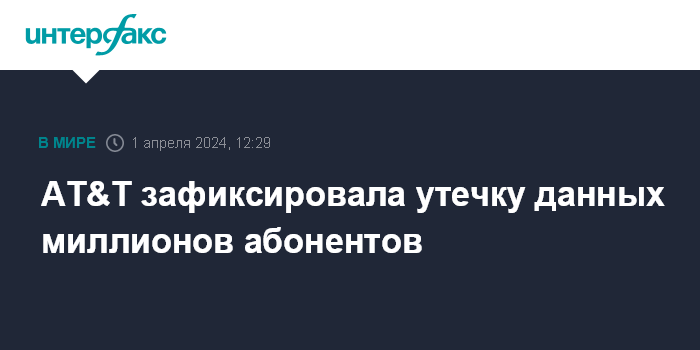 Москва. 1 апреля. INTERFAX.RU - Американская телекоммуникационная компания AT&T Inc. сообщила, что зафиксировала утечку данных порядка 7,6 млн действующих и 65,4 млн бывших клиентов.