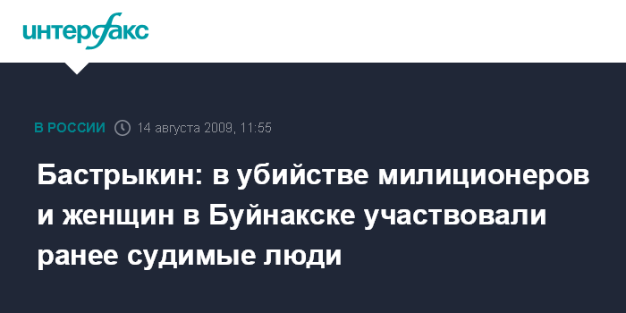 Москва. 14 августа. INTERFAX.RU - Личности бандитов, совершивших убийство женщин и работников милиции в Буйнакске, установлены, заявил глава СКП РФ Александр Бастрыкин. "Я еще раз уточню, насколько эта информация объективна. Мне доложили, что установочные данные - фамилии, имена, отчества двух бандитов. Это ранее судимые лица. Если это так, то только осталось объявить их в розыск", - сказал Бастрыкин в пятницу журналистам в Сочи.