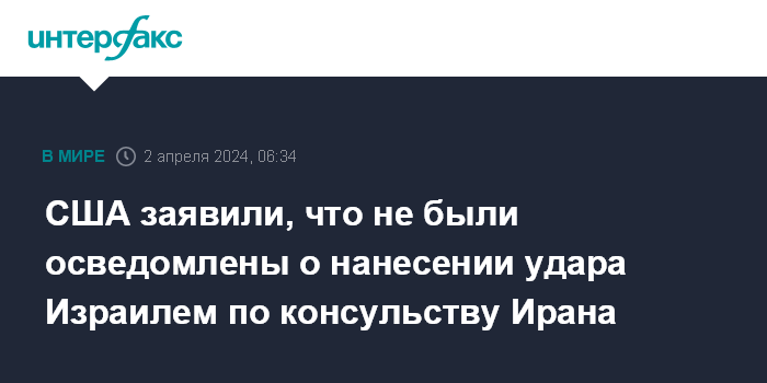 Москва. 2 апреля. INTERFAX.RU - Администрация США сообщила, что в Вашингтоне не знали об ударе по иранскому консульству в Дамаске и не были к этому причастны, сообщил телеканал CNN.