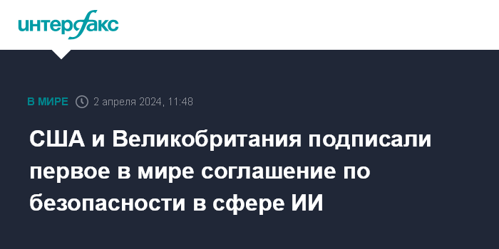 Москва. 2 апреля. INTERFAX.RU - США и Великобритания заключили двусторонний договор в сфере безопасности при использовании технологий искусственного интеллекта (ИИ), тем самым став первыми странами, которые официально начали сотрудничать при тестировании и оценке рисков использования ИИ. Об этом сообщает во вторник Financial Times (FT).