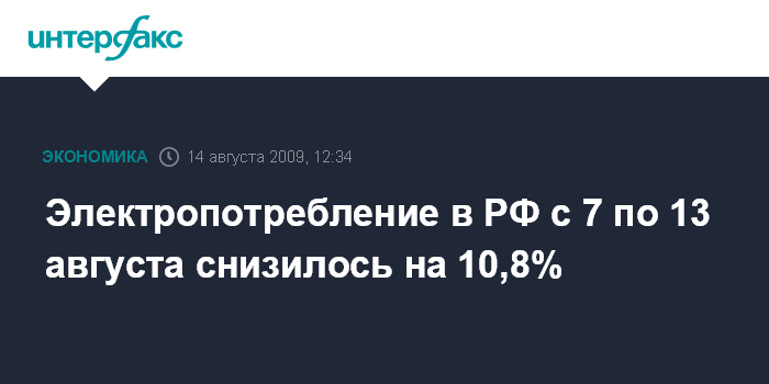 Электропотребление в РФ с 7 по 13 августа снизилось на 10,8%