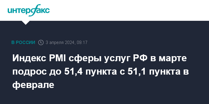 Москва. 3 апреля. INTERFAX.RU - Индекс PMI сферы услуг России в марте 2024 года составил 51,4 пункта, поднявшись с февральских 51,1 пункта, говорится в материалах исследования S&P Global.