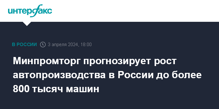 Москва. 3 апреля. INTERFAX.RU - Минпромторг ожидает, что в 2024 году производство новых автомобилей всех сегментов в России превысит 800 тысяч единиц, а продажи - превысят 1,3 млн, сообщил вице-премьер, глава Минпромторга Денис Мантуров журналистам посла отчета правительства в Госдуме.
