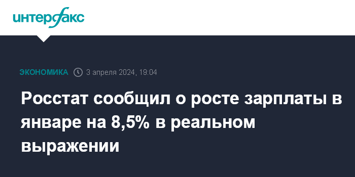 Москва. 3 апреля. INTERFAX.RU - В России в январе 2024 года рост реального размера (с поправкой на инфляцию) заработной платы составил 8,5% после повышения также на 8,5% в декабре 2023 года и на 7,2% в ноябре, сообщил Росстат.