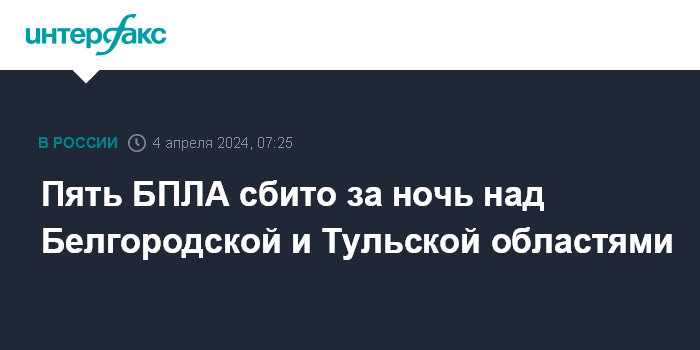 Москва. 4 апреля. INTERFAX.RU - Российские военные сообщили, что средства противовоздушной обороны в ночь на четверг уничтожили пять украинских беспилотников в небе над Белгородской и Тульской областями.