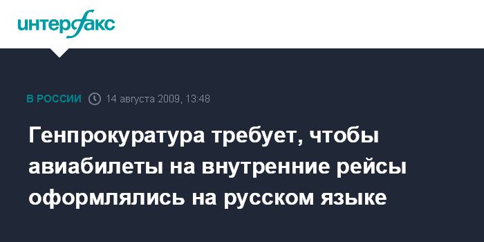 Москва. 14 августа. INTERFAX.RU - В Генеральной прокуратуре РФ считают необоснованным оформление российскими авиакомпаниями электронных билетов на внутренние авиарейсы на английском языке, а также с использованием латинского алфавита.