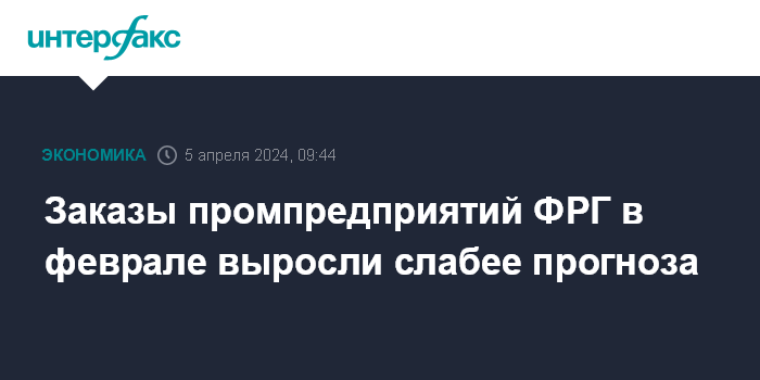 Совокупный объем заказов германских промпредприятий в феврале уменьшился на 10,6% по сравнению с тем же месяцем 2023 года (-6,2% в январе).