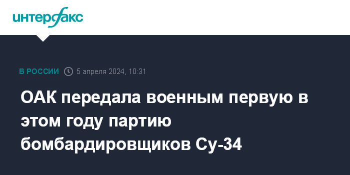 "Все заводы ОАК, задействованные в исполнении гособоронзаказа, не снижают темпы производства. Первой партией фронтовых бомбардировщиков Су-34 мы начали поставки самолетов в рамках производственной программы текущего года", - сказал через пресс-службу гендиректор ОАК Юрий Слюсарь.