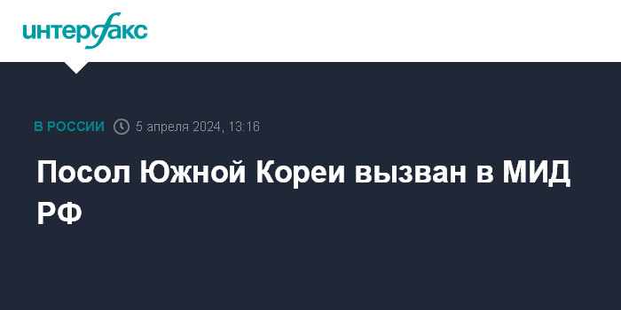 Москва. 5 апреля. INTERFAX.RU - Посол Республики Корея Ли До Хун в Москве в пятницу был вызван в МИД России, сообщили в российском дипломатическом ведомстве.
