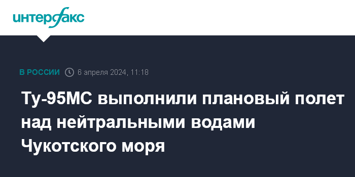 Москва. 6 апреля. INTERFAX.RU - Два стратегических ракетоносца Ту-95МС дальней авиации выполнили плановый полет в воздушном пространстве над нейтральными водами акватории Чукотского моря, сообщили в Минобороны РФ в субботу.