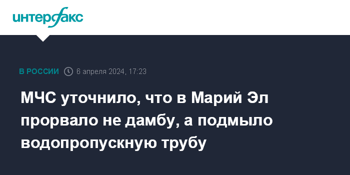 Москва. 6 апреля. INTERFAX.RU - Сообщения об обрушении дамбы пруда в Куженерском районе Марий Эл спасателям не поступали, говорится в телеграм-канале республиканского управления МЧС в субботу.