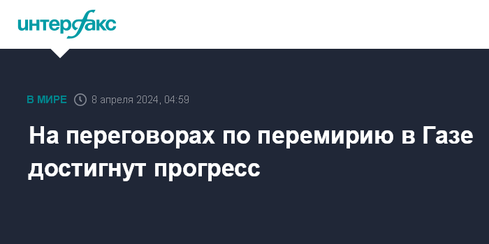 Москва. 8 апреля. INTERFAX.RU - В ходе переговоров в Каире о перемирии в секторе Газа был достигнут прогресс, стороны пришли к соглашению по основным пунктам, сообщил в понедельник египетский государственный телеканал "Аль-Кахера" со ссылкой на информированный источник.