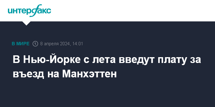 Москва. 8 апреля. INTERFAX.RU - С середины июня въезд автомобилей на Манхэттен в Нью-Йорке будет облагаться сбором в $15 в целях сокращения пробок на дорогах, сообщило издание Axios.